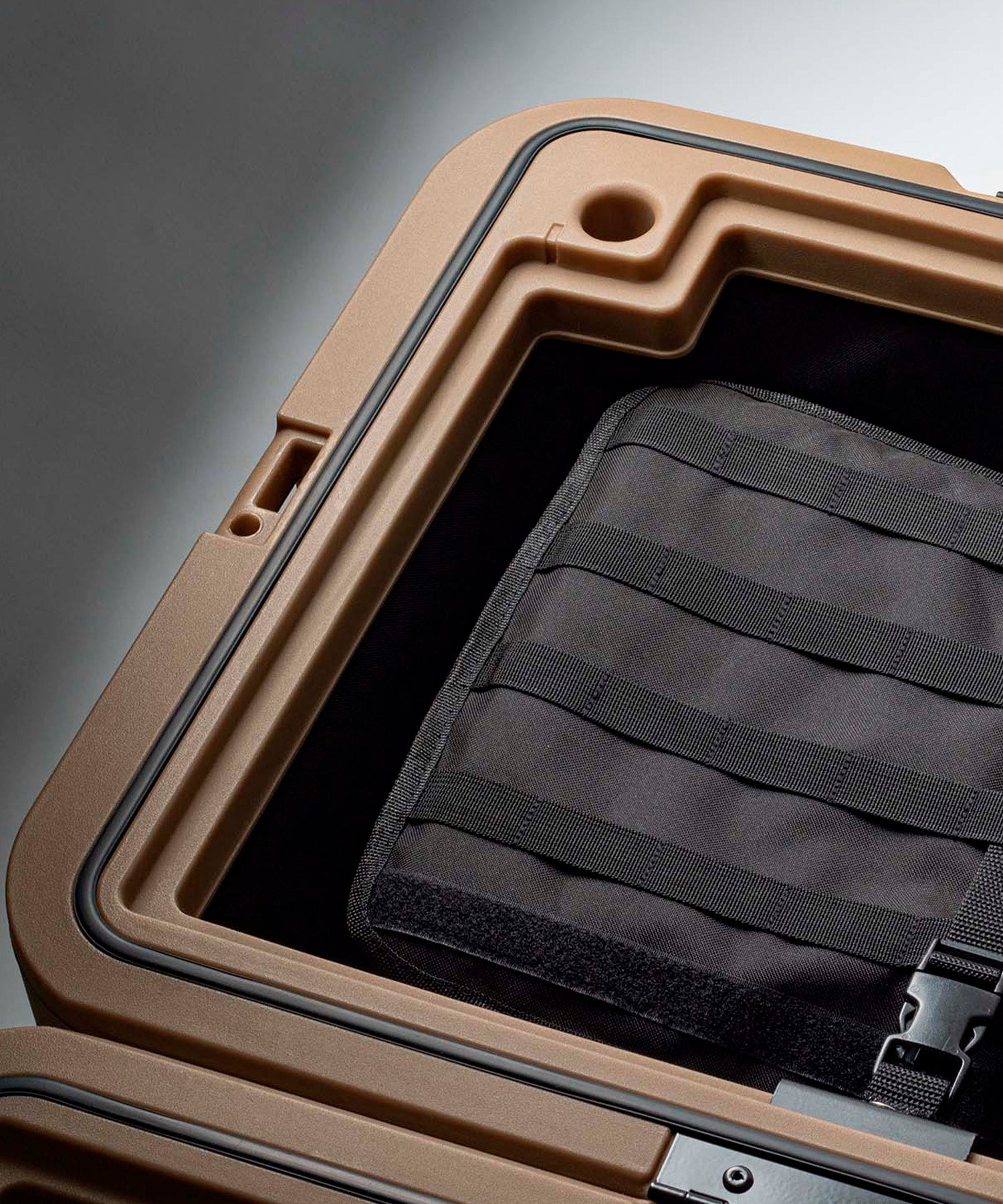 Included with the rail system in the upper lid are movable straps to secure weapons and accessories. A removable MOLLE divider separates and protects your gear and allows flexible storage options.