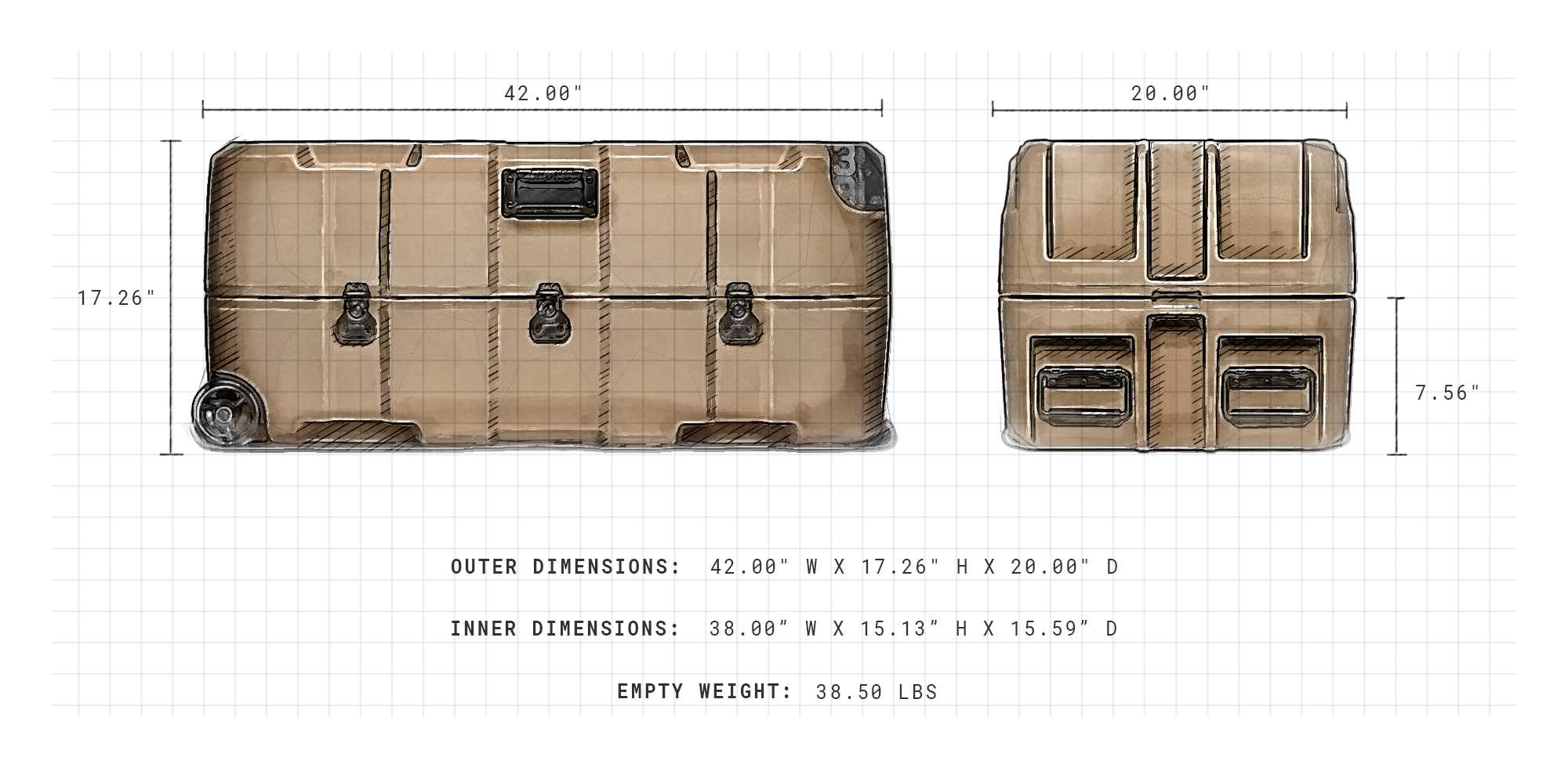 The Bronc 38 outer dimensions are 42"L x 20"W x 17.26"H, and weighs about 59 pounds when empty.
